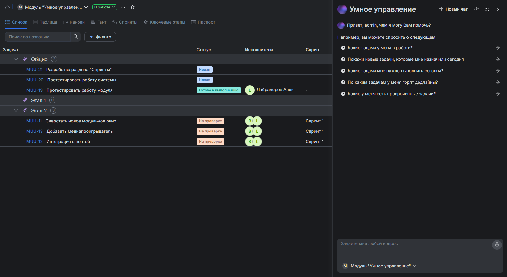 Он понимает запросы на обычном человеческом языке (текстом или голосом) и сам выполняет действия в системе: ищет данные, создает задачи, строит отчеты и помогает ориентироваться в интерфейсе.